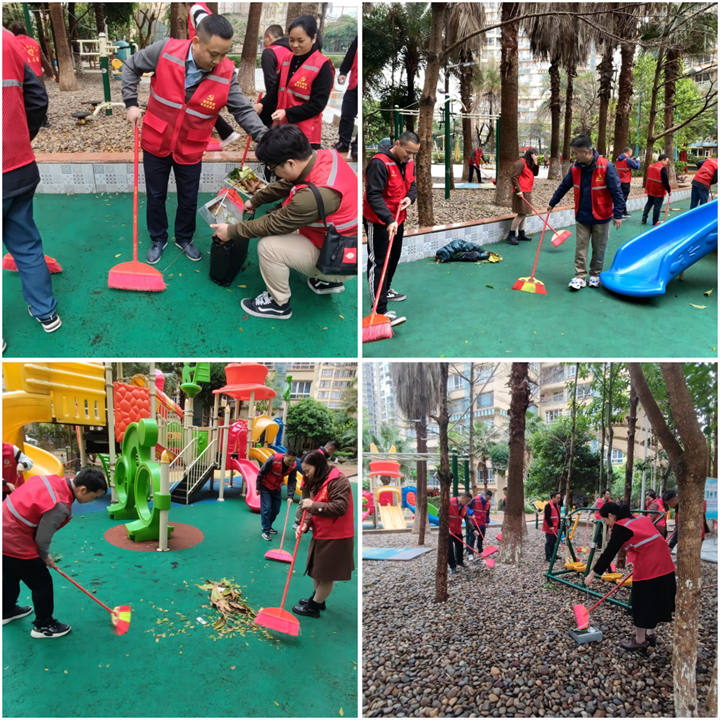 活動中,支部黨員與社區志愿者們分工協作,干勁十足,深入衛生死角,拿起掃帚等工具清理居民小區健身器材區與孩子們游樂區散落的枝葉與垃圾。在志愿者們的共同努力下,健身區與游樂區煥然一新,提升了人居環境質量,得到了小區居民的點贊,形成了“黨建引領、鄰里協力、共建幸福”的良好局面。