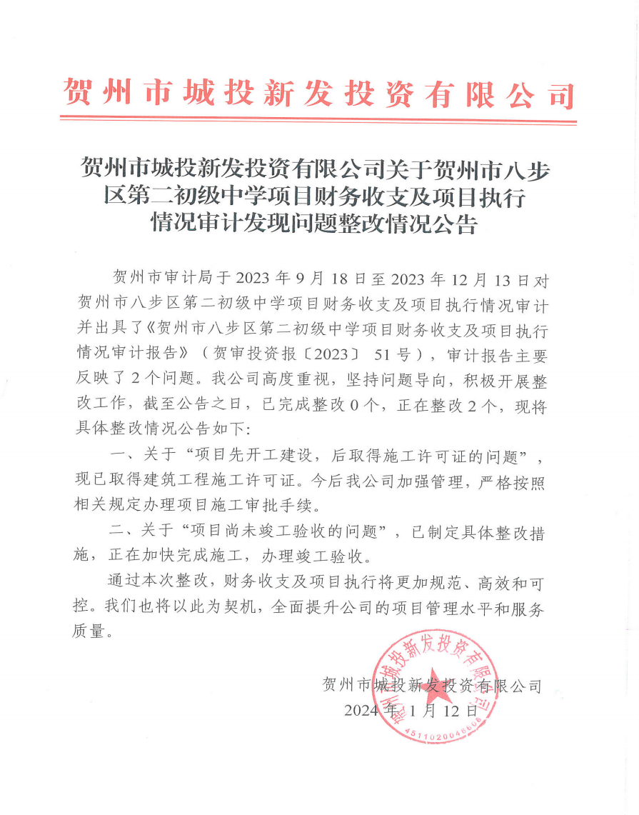 關于賀州市八步區第二初級中學項目財務收支及項目執行情況審計發現問題整改情況公告2024-01-31