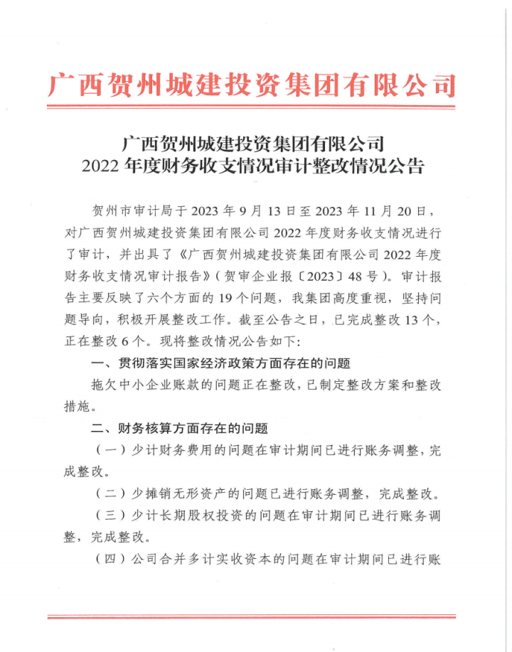 廣西賀州城建投資集團有限公司2022年度財務收支情況審計整改情況公告2024-03-27