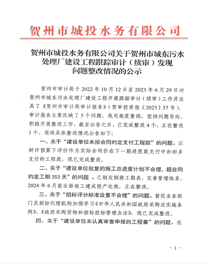 賀州市城投水務有限公司關于賀州市城東污水處理廠建設工程跟蹤審計2024-04-10
