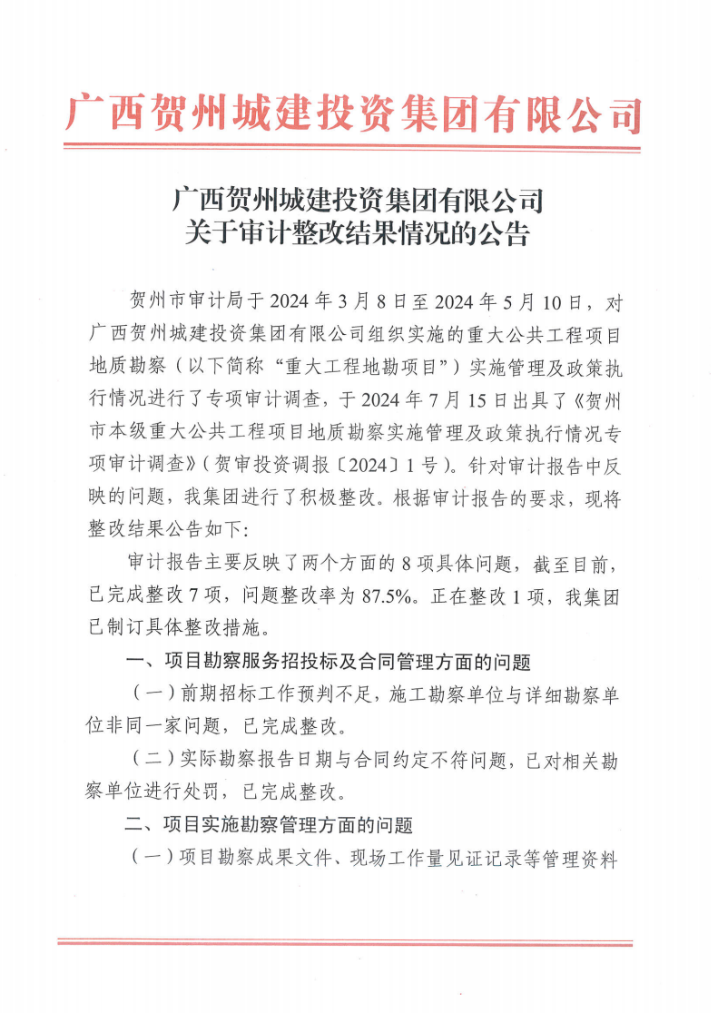 廣西賀州城建投資集團有限公司關于審計整改結果情況的公告2024-10-11