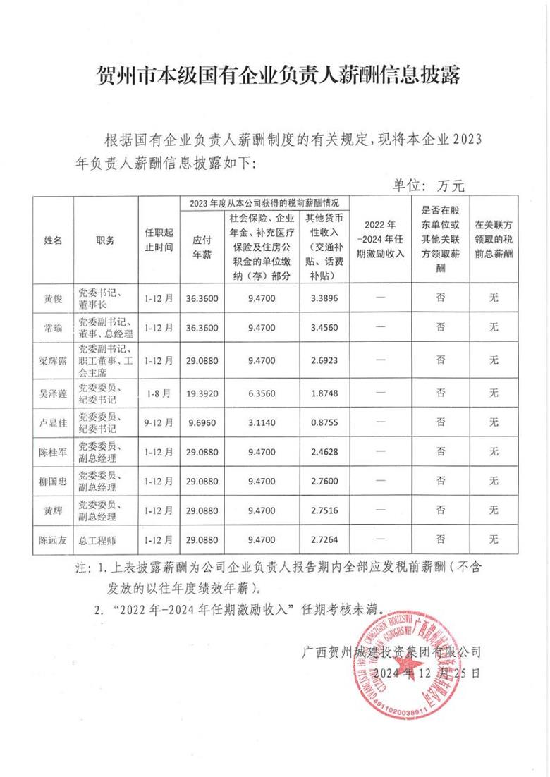 賀州市本級國有企業負責人薪酬信息披露2024-12-25